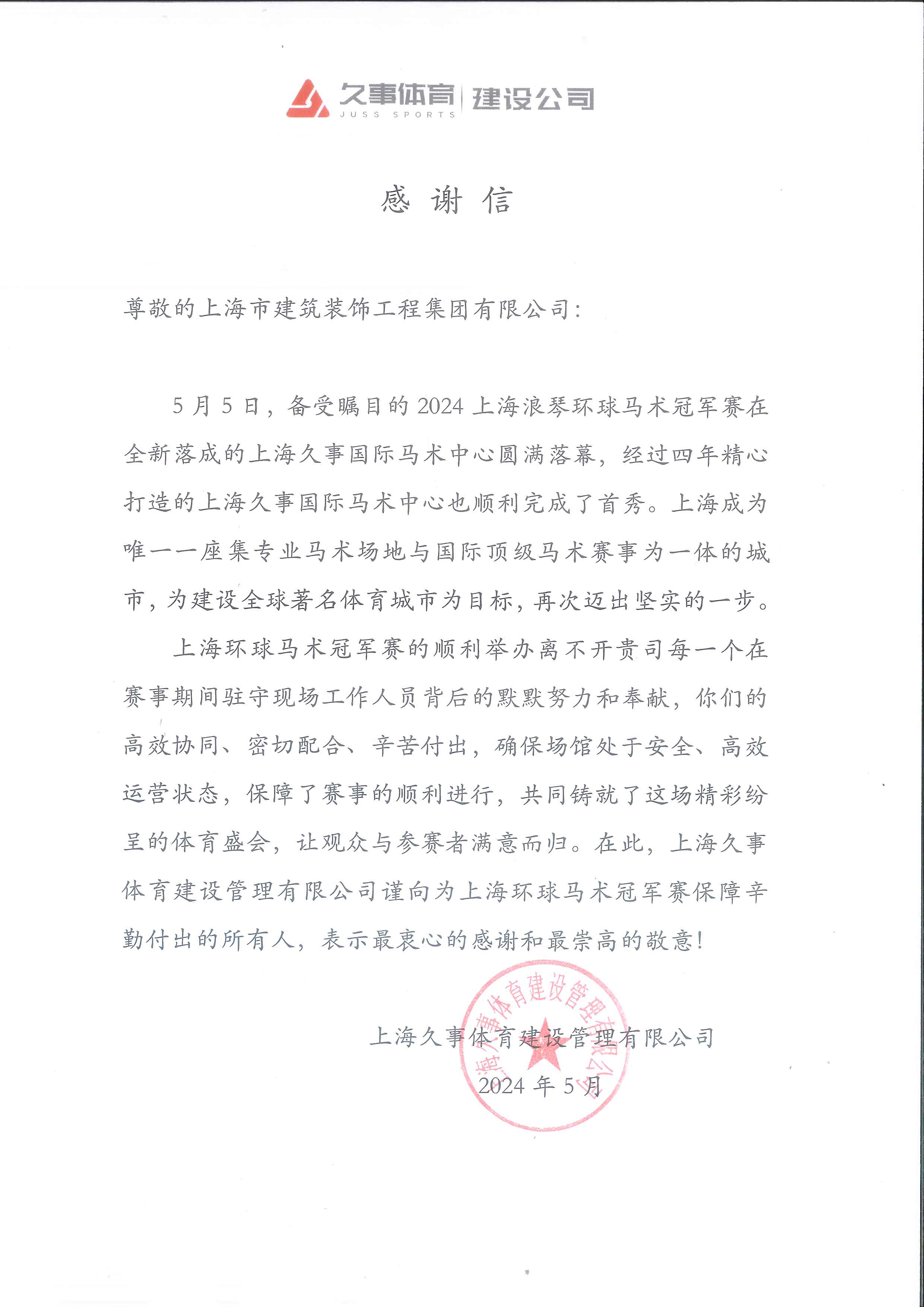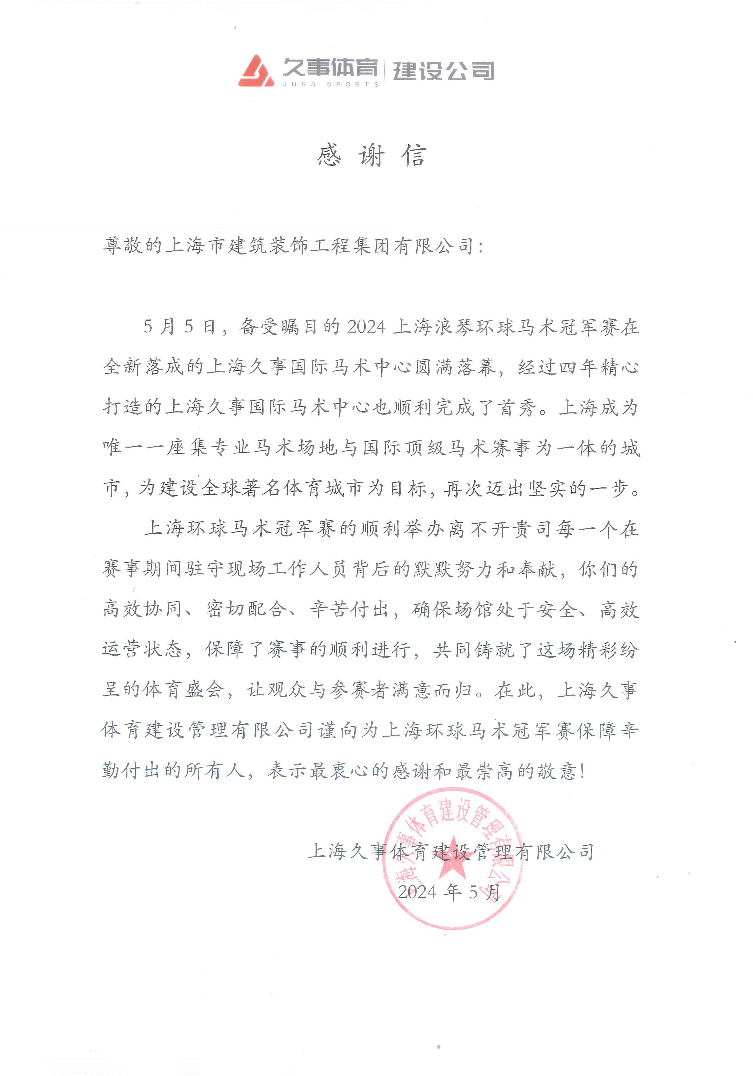 5月下旬,集团收到上海久事体育建设管理有限公司发来的感谢信。信中提到,由装饰集团联合各建设方共同打造的上海久事国际马术中心在2024年上海浪琴环球马术冠军赛中成功完成了其首秀。集团项目团队以专业的技术和卓越的执行力,确保了场馆的高品质呈现和完美运行,赢得了业主方的高度评价。 上海久事国际马术中心的圆满落成,标志着上海成为了全球唯一一座集专业马术场地与国际顶级马术赛事为一体的城市,再次向全球展示了上海建设全球著名体育城市的坚定决心和实力。这场精彩纷呈的体育盛会的成功举办,离不开集团马术馆项目部的每一位工作人员的默默付出和辛勤努力,他们始终坚守岗位,高效协同,密切配合,为赛事的顺利进行提供了坚实的保障。